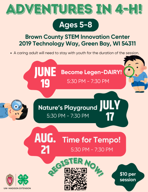 Is your family up for an adventure? Brown County 4-H presents Adventures in 4-H! 3 adventurous sessions diving into topics such as dairy, nature and all of its resources, and instruments. While these session are designed for youth ages 5-8, this will be fun for the whole family!